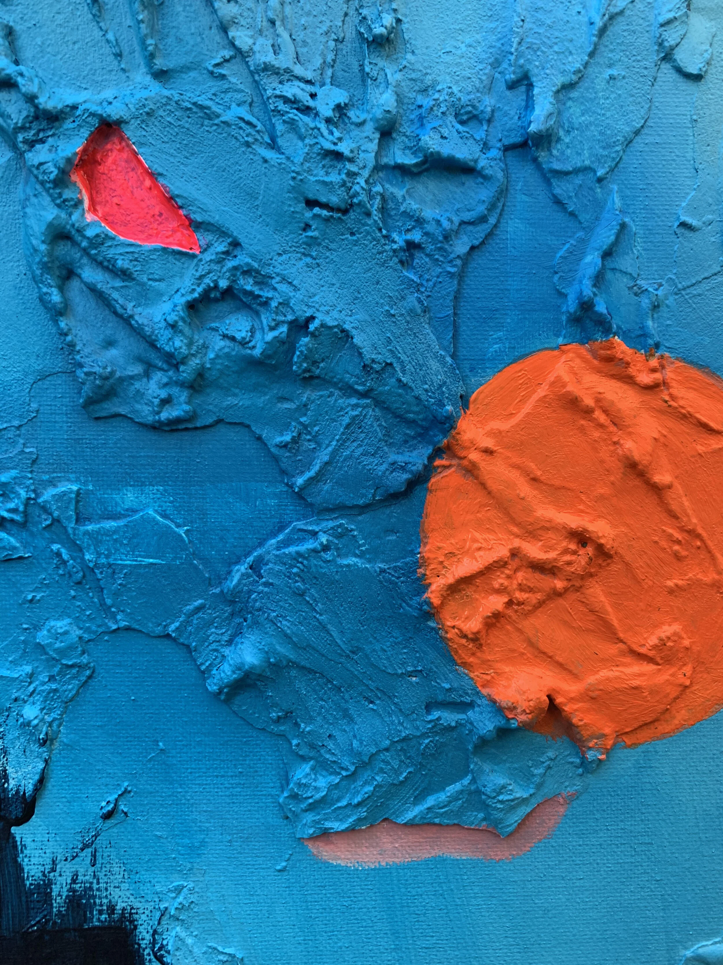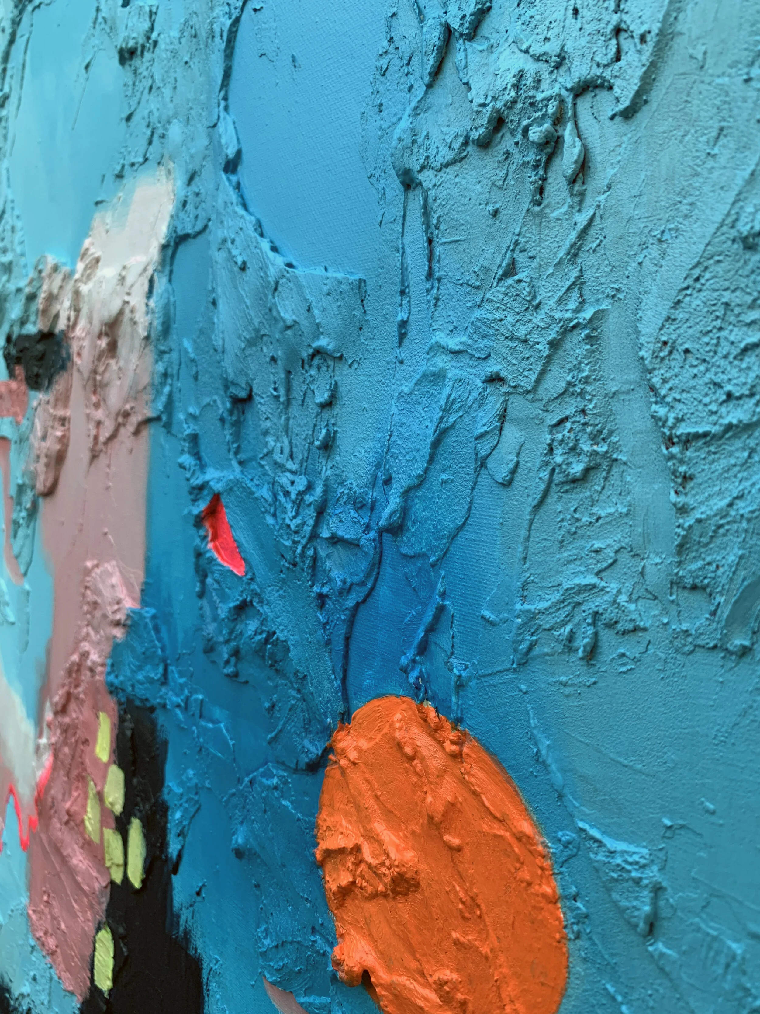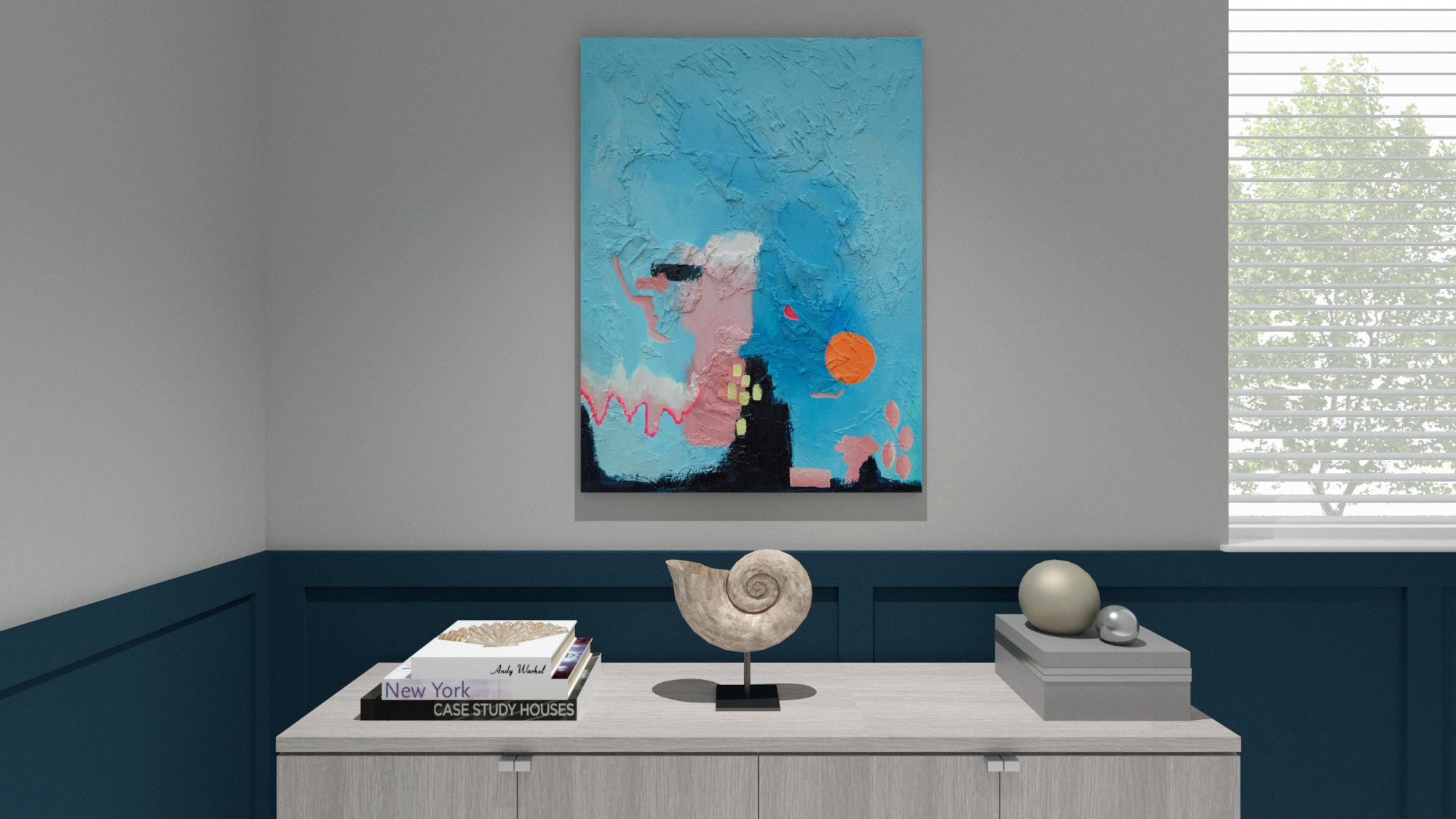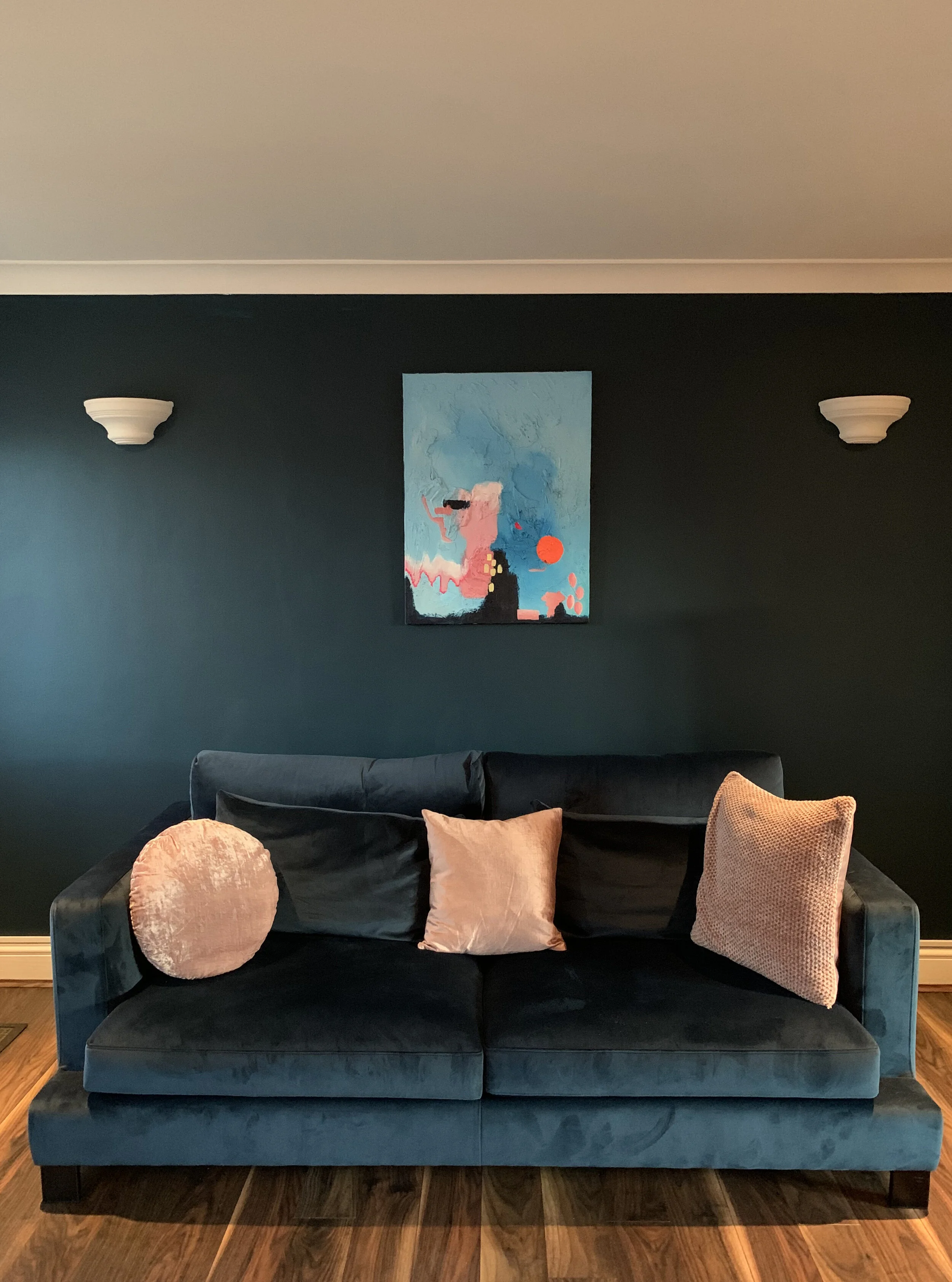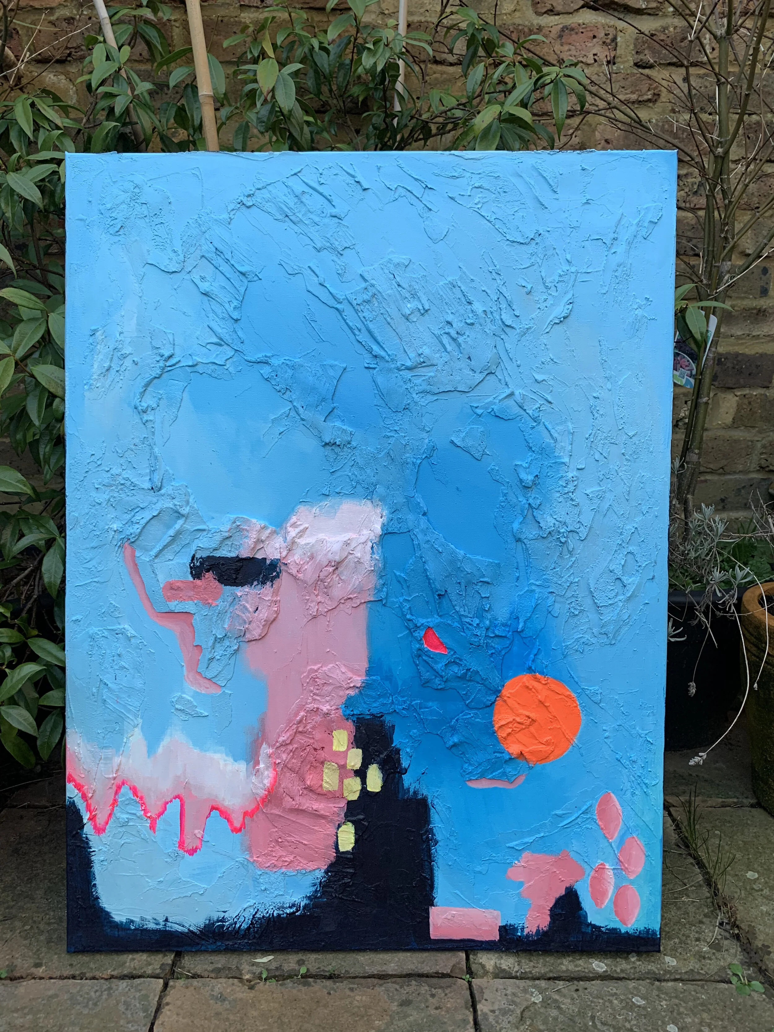 The edges are finished a deep navy blue to exaggerate the lighter, brighter colours in the painting. The surface of the painting is plaster on canvas which creates beautiful texture, casting different lights on the art work at different times of the day.