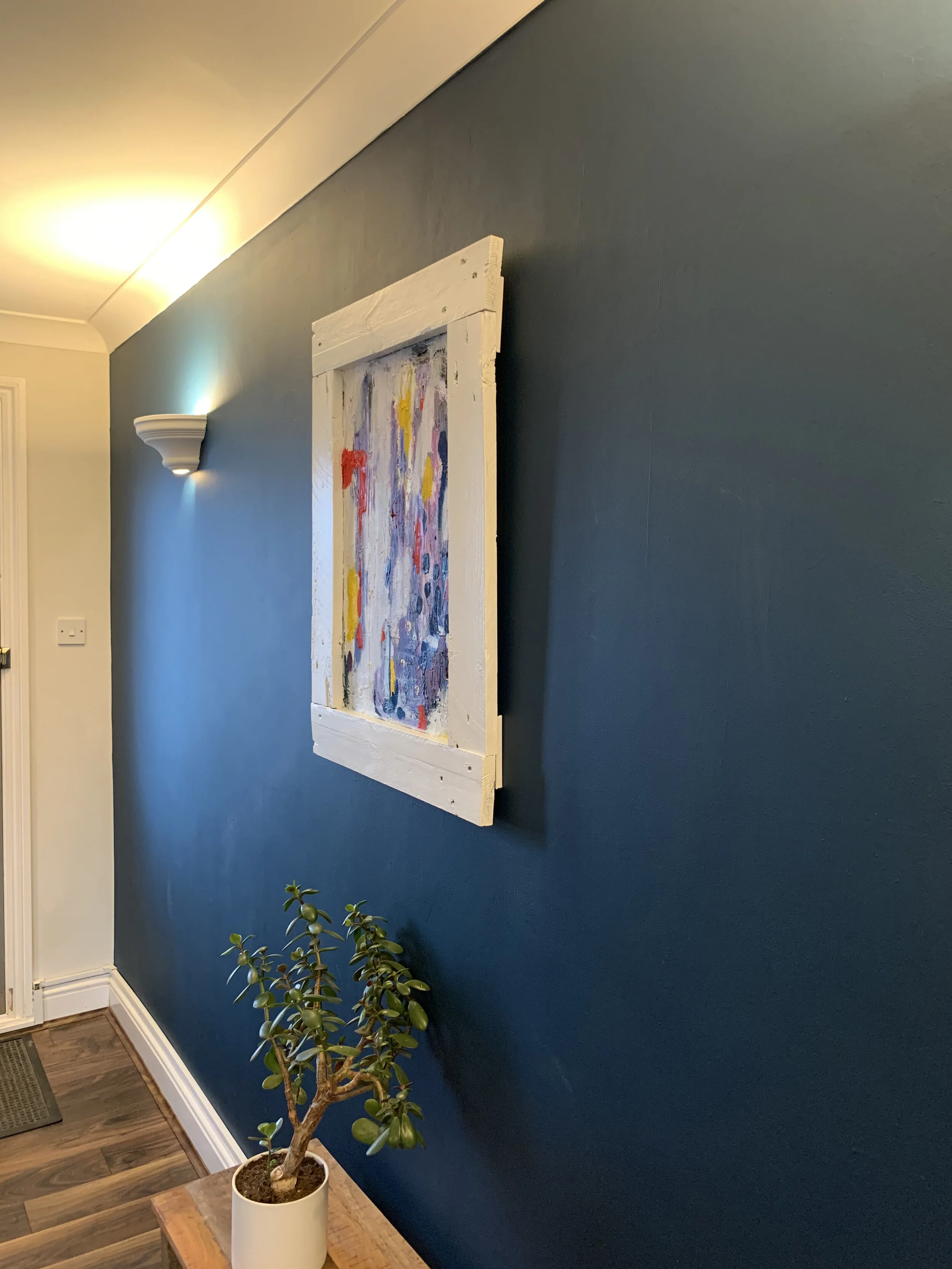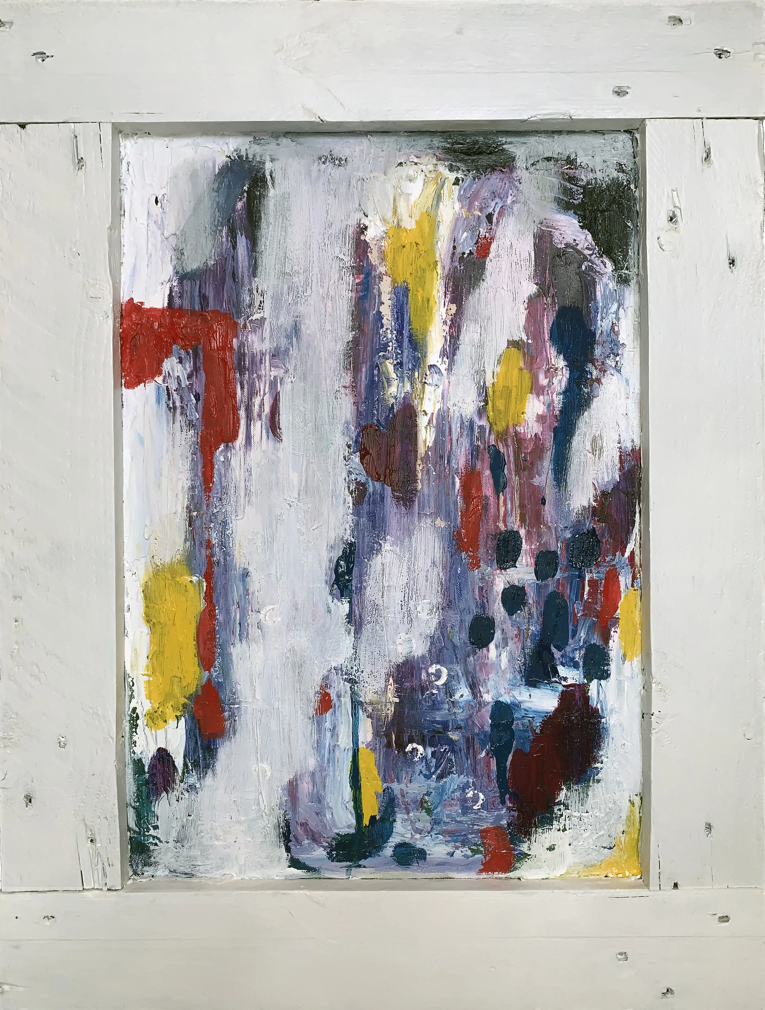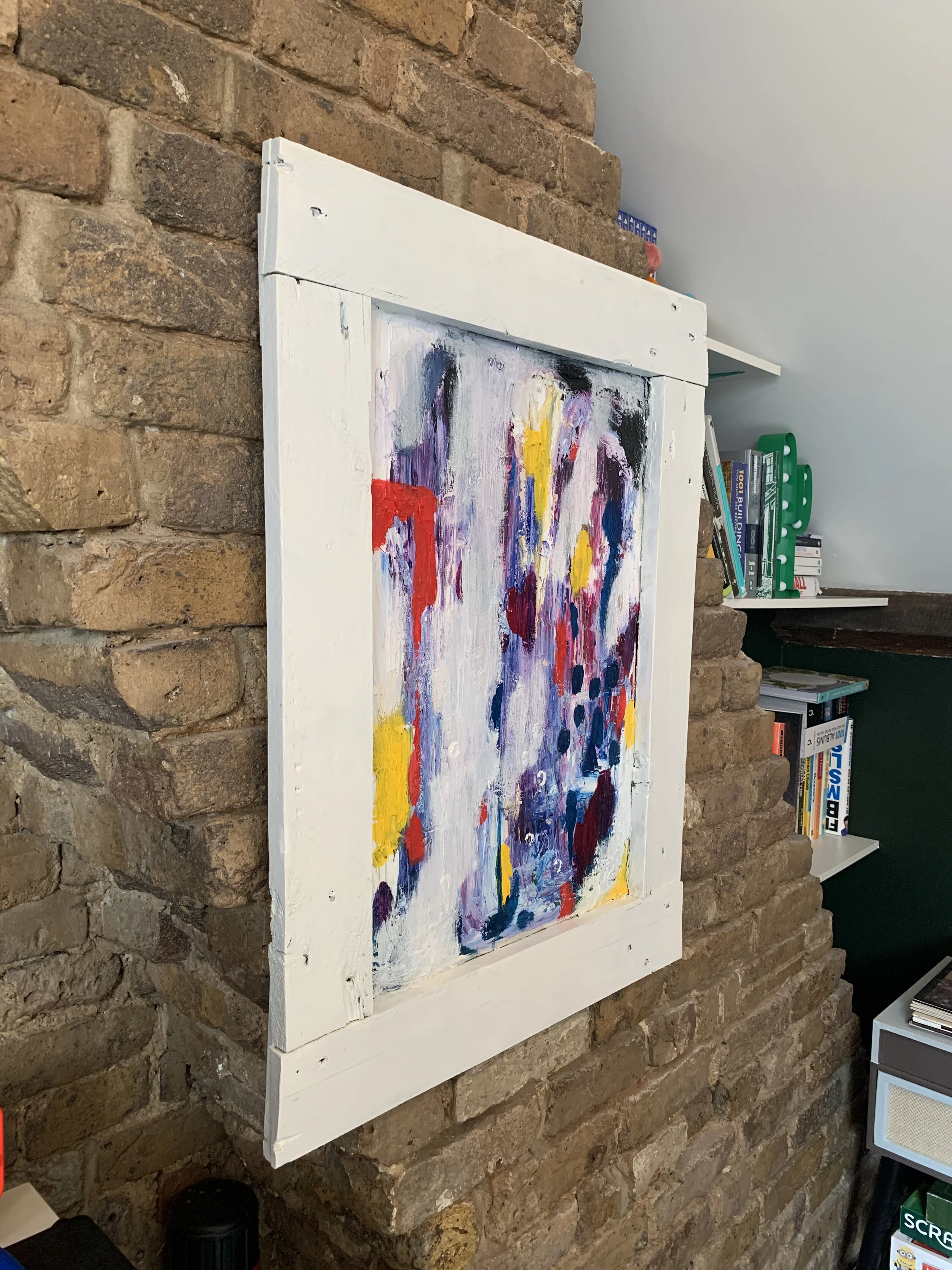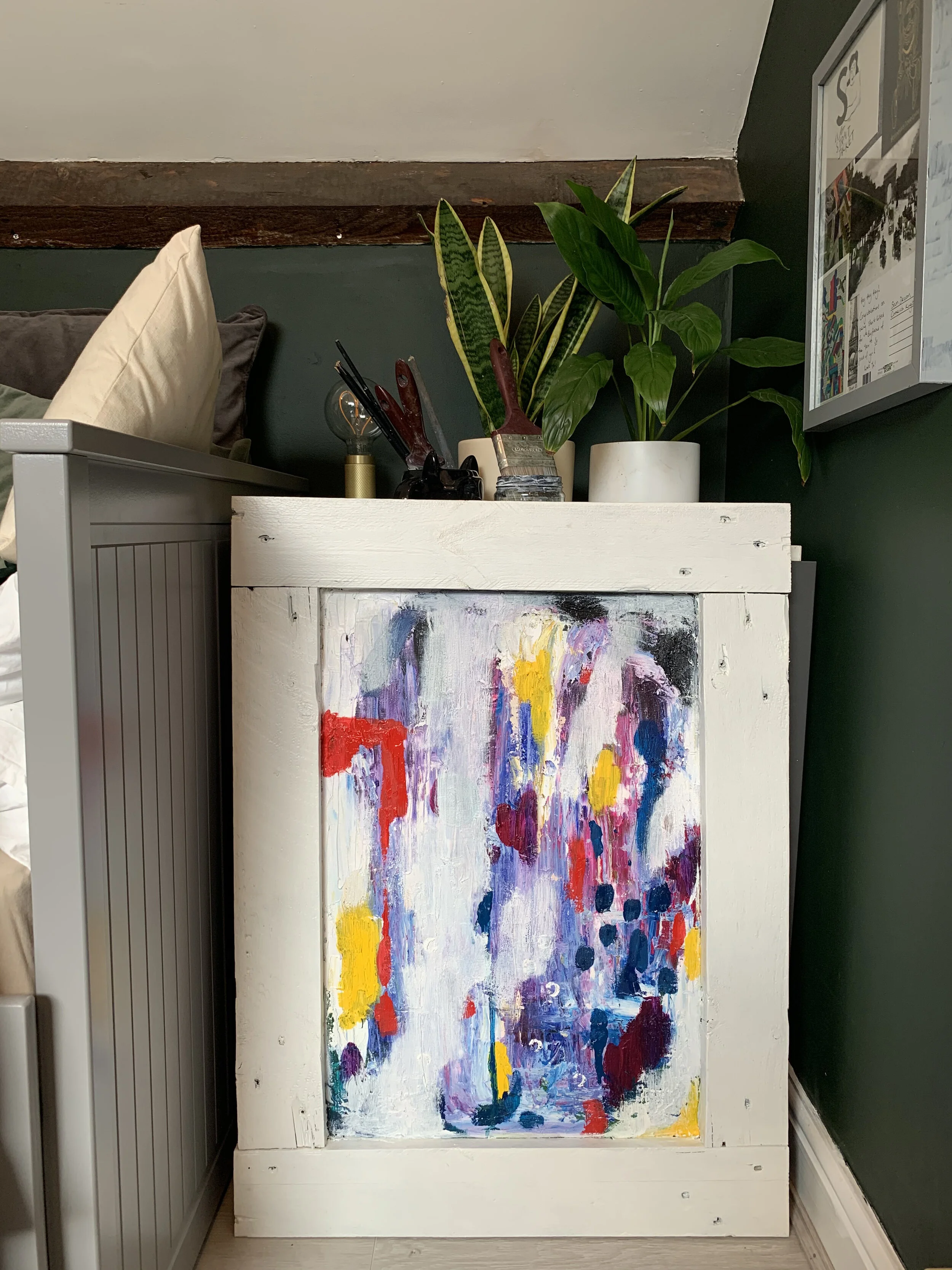 Abstract Form 2 is the second painting in the series, combining colourful oil and acrylic paints on canvas within a frame made from a recycled wooden palette.