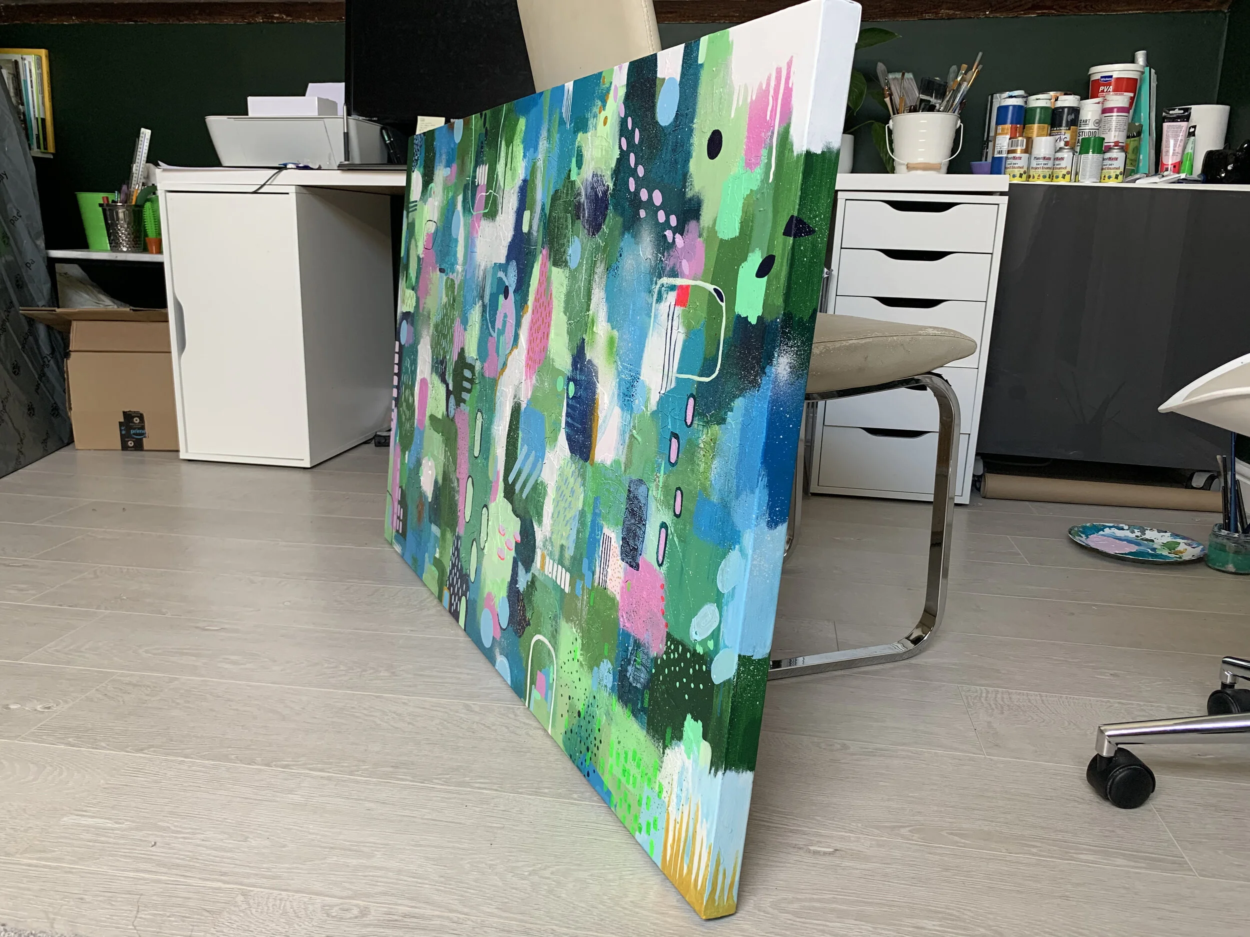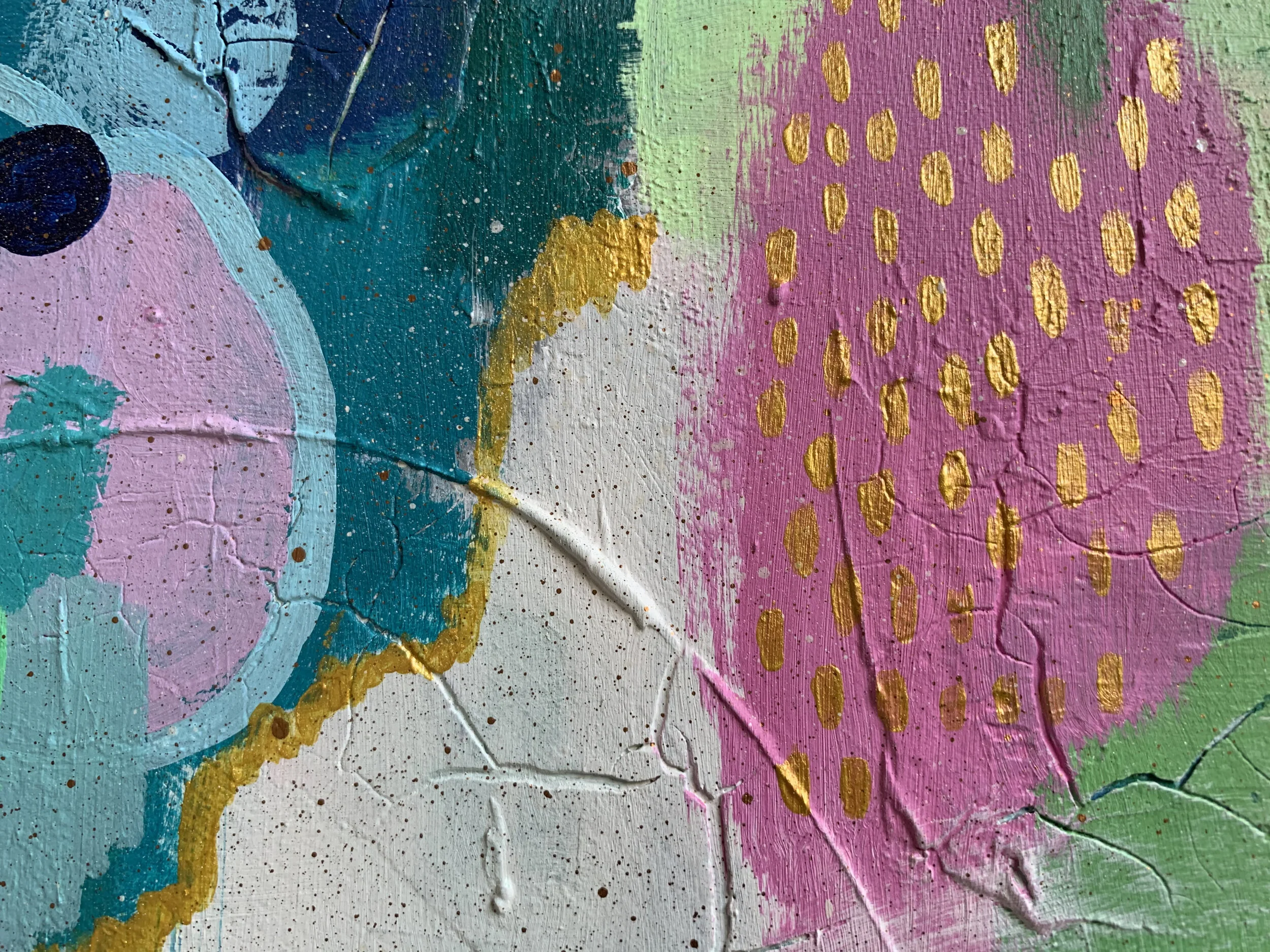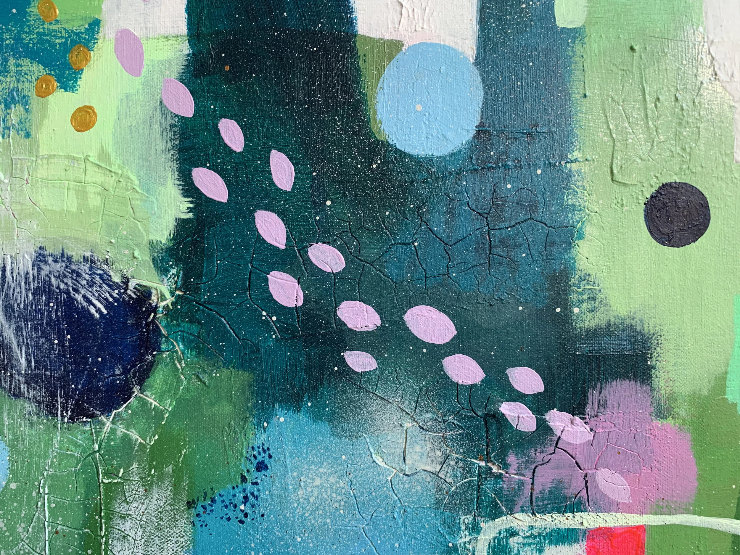 Inspired by the colours from an abstract photoshop illustration Samuel created, this painting blends beautiful cool colours with patterns and textures to create an eye catching composition.