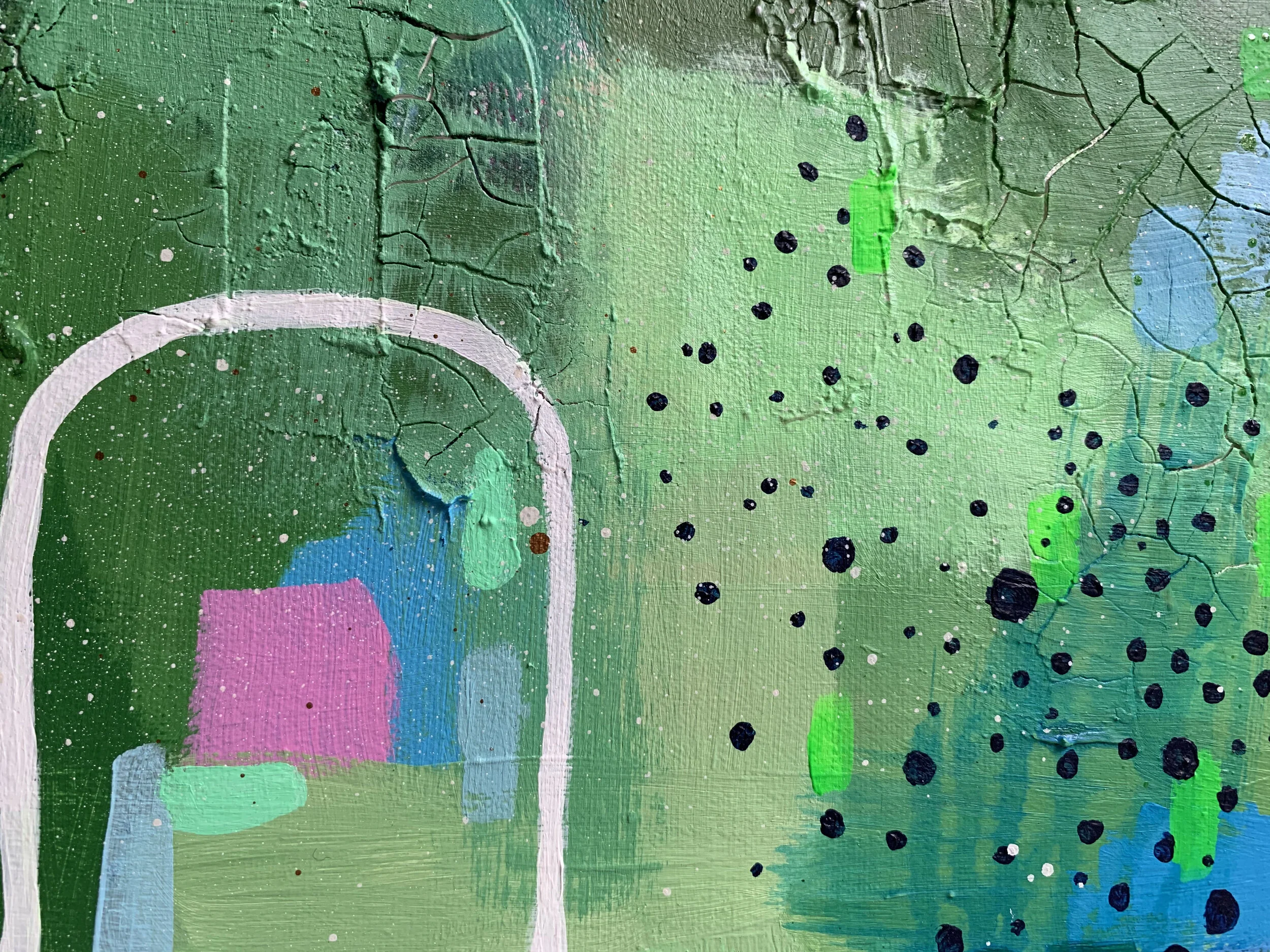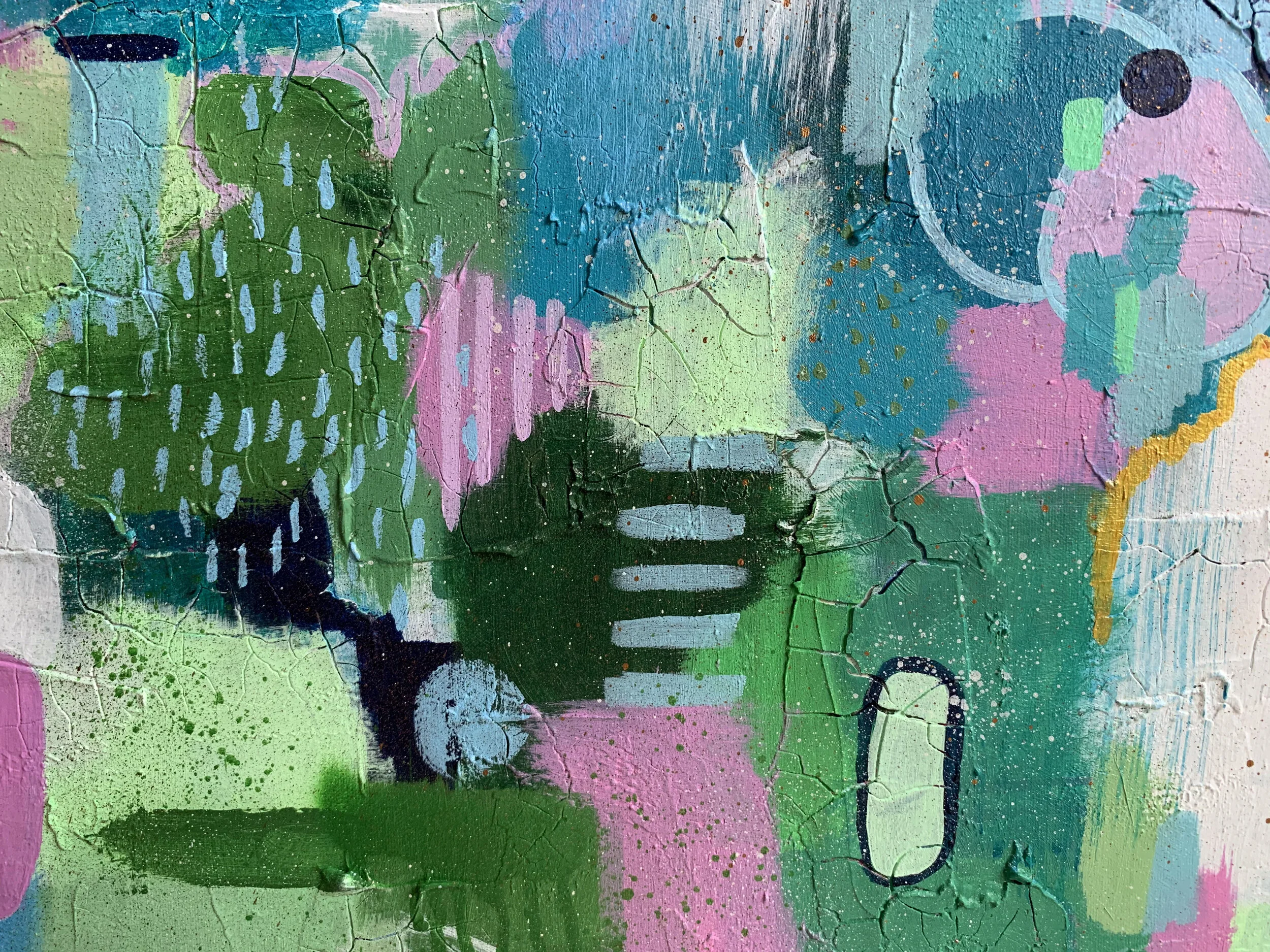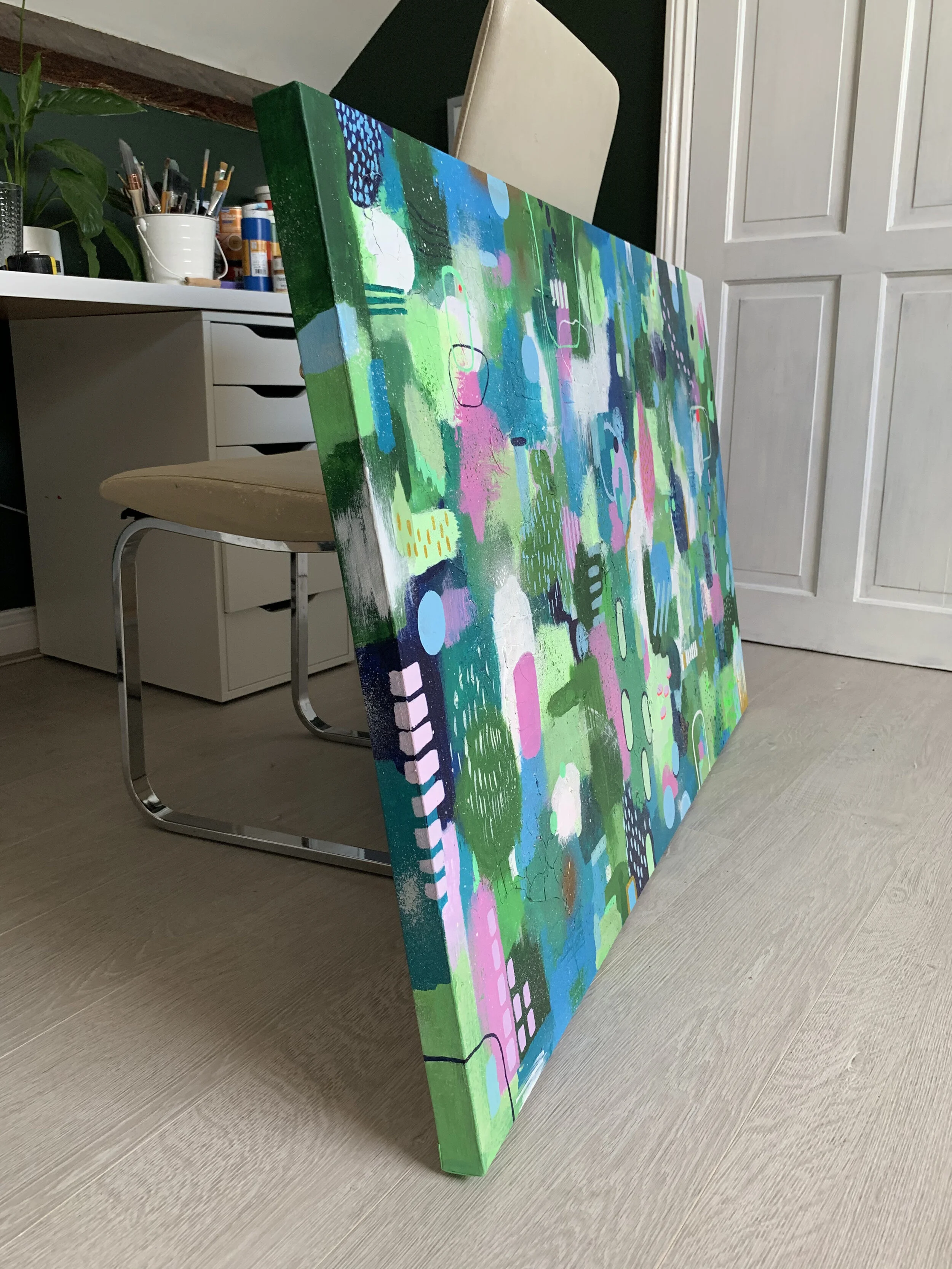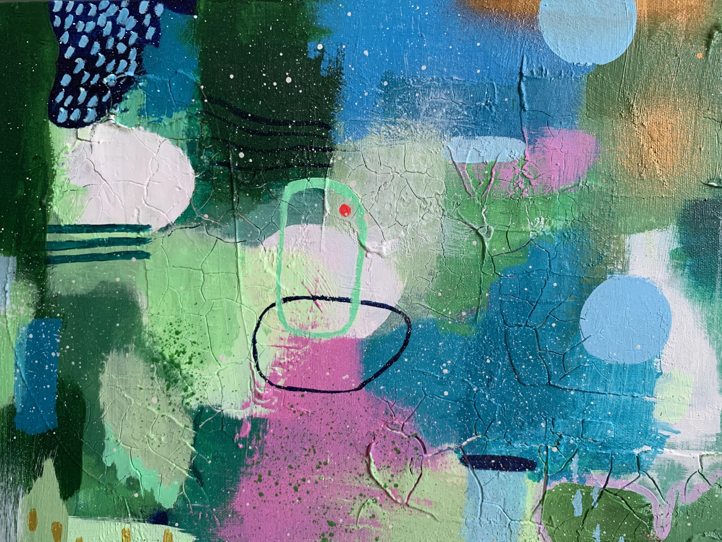 Inspired by the colours from an abstract photoshop illustration Samuel created, this painting blends beautiful cool colours with patterns and textures to create an eye catching composition.