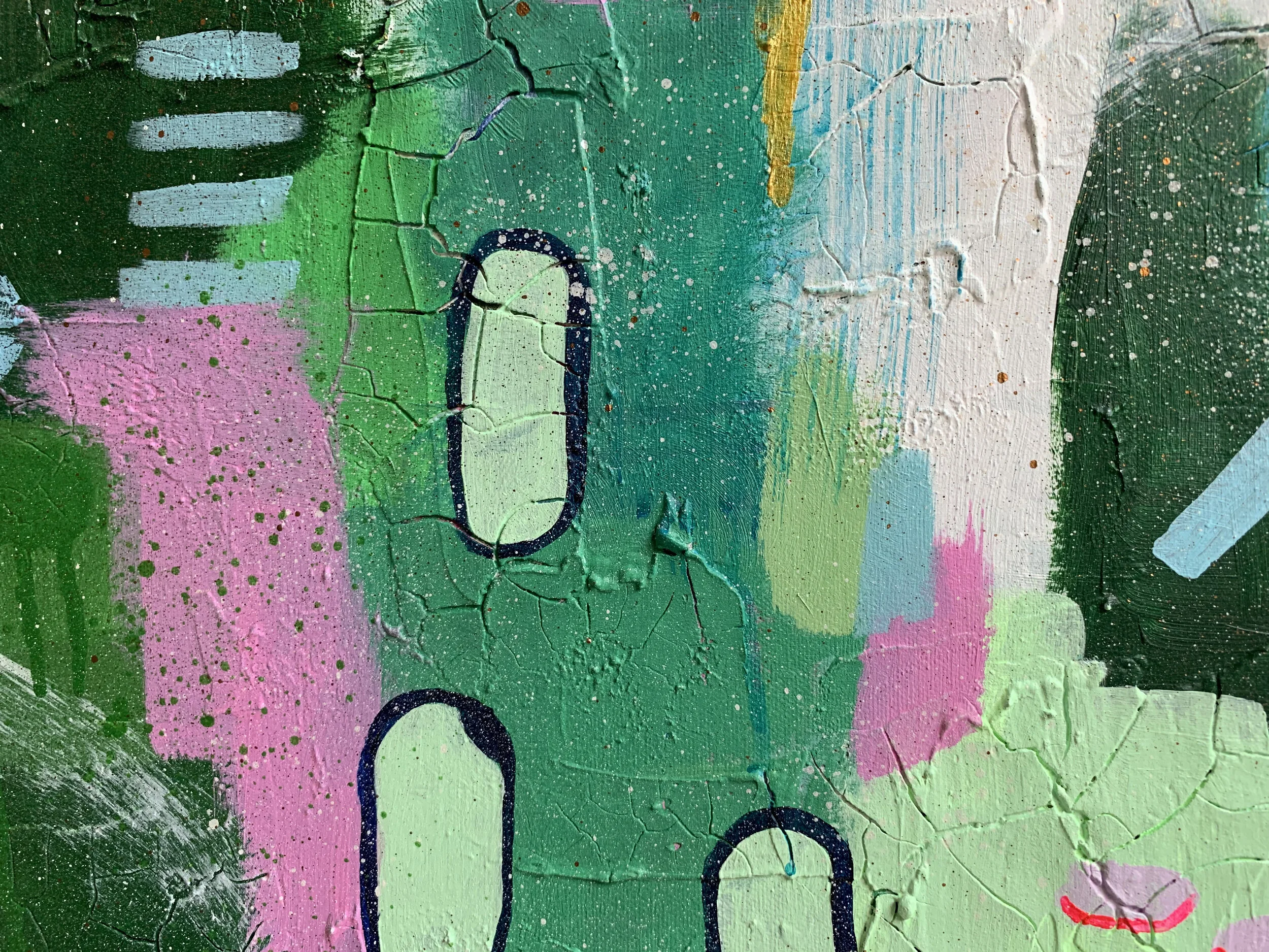The paint wraps around the edges of this 122cm x 76cm canvas for end to end colour. Spray paints and acrylic paints were used on a canvas covered with cracked clay medium, Samuel’s signature materials.