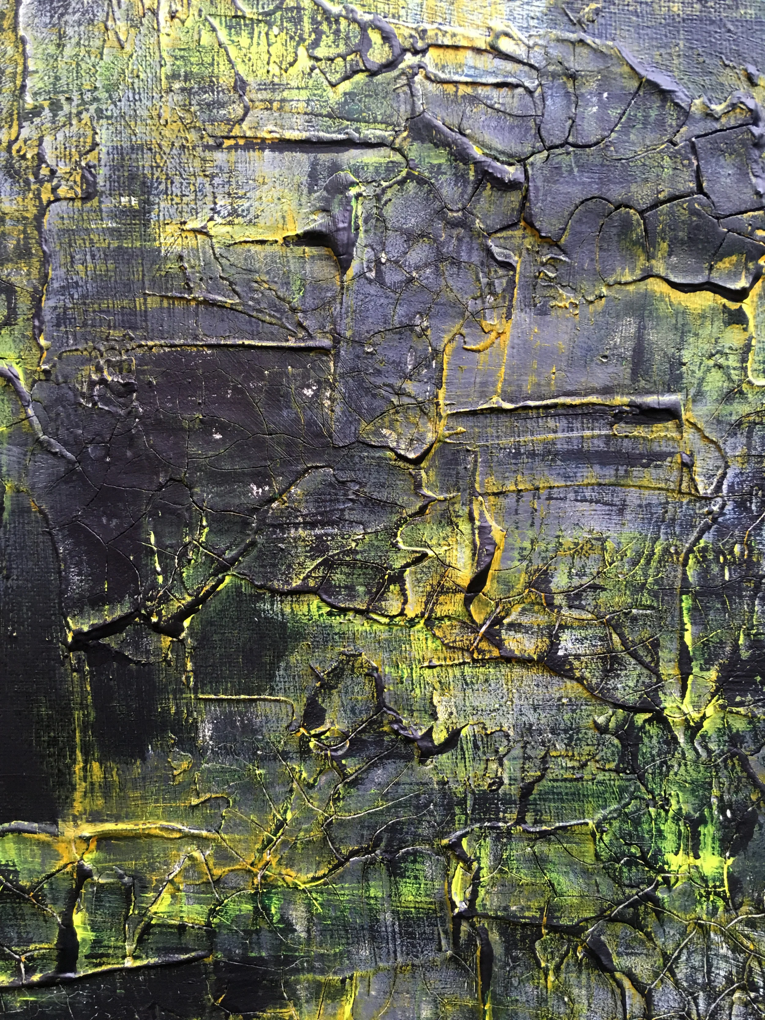 Lightning is a 40cm x 50cm abstract painting that uses black, white and yellow paints over a cracked clay canvas to create a composition inspired by lightning.