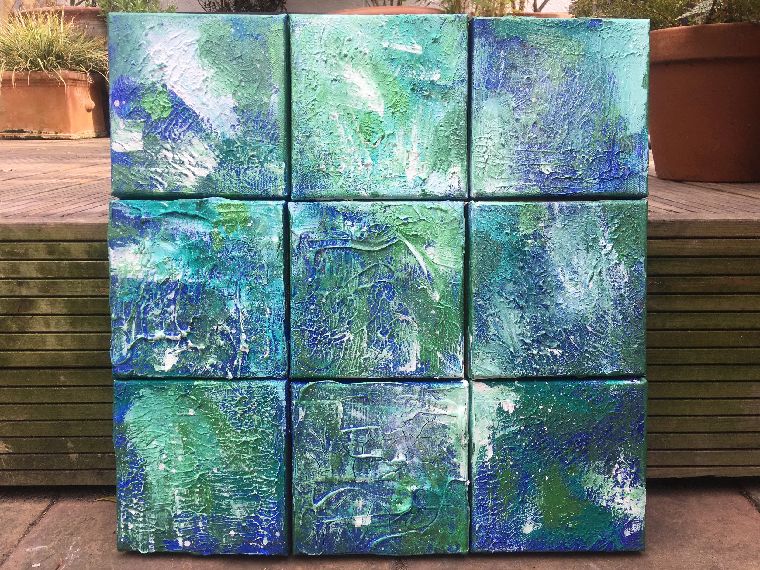 Patchwork is a collection of 9 of these small canvases, clipped together to create a 40cm x 40cm composition and painted over from their original colours to create one cohesive painting.