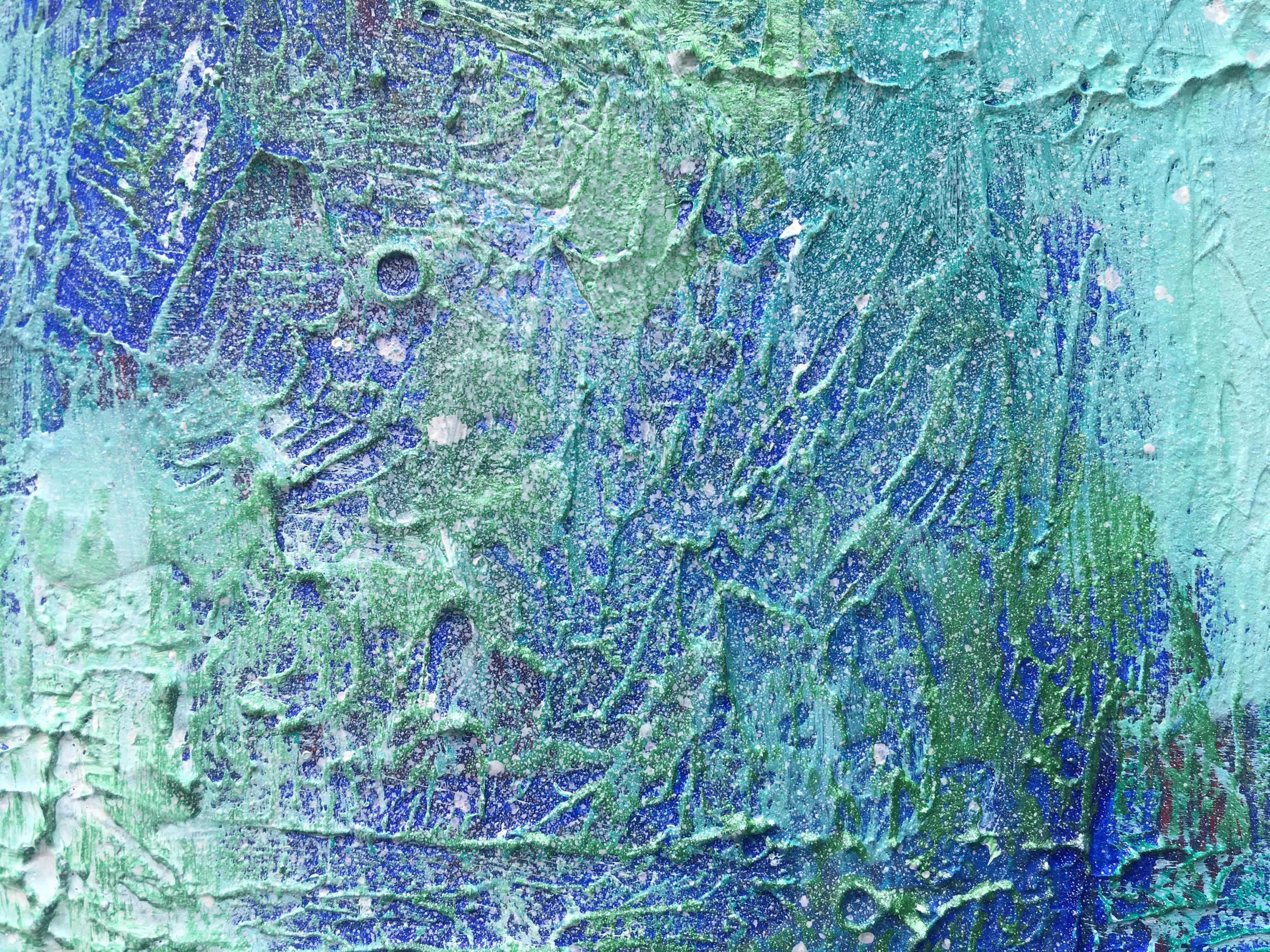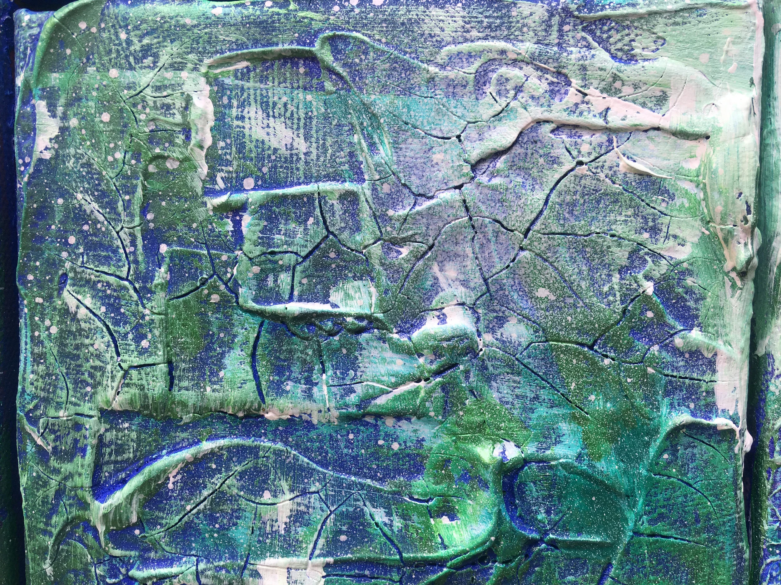 The collection uses a combination of plaster, clay, acrylic paints and liquid paints in a green and blue tones.