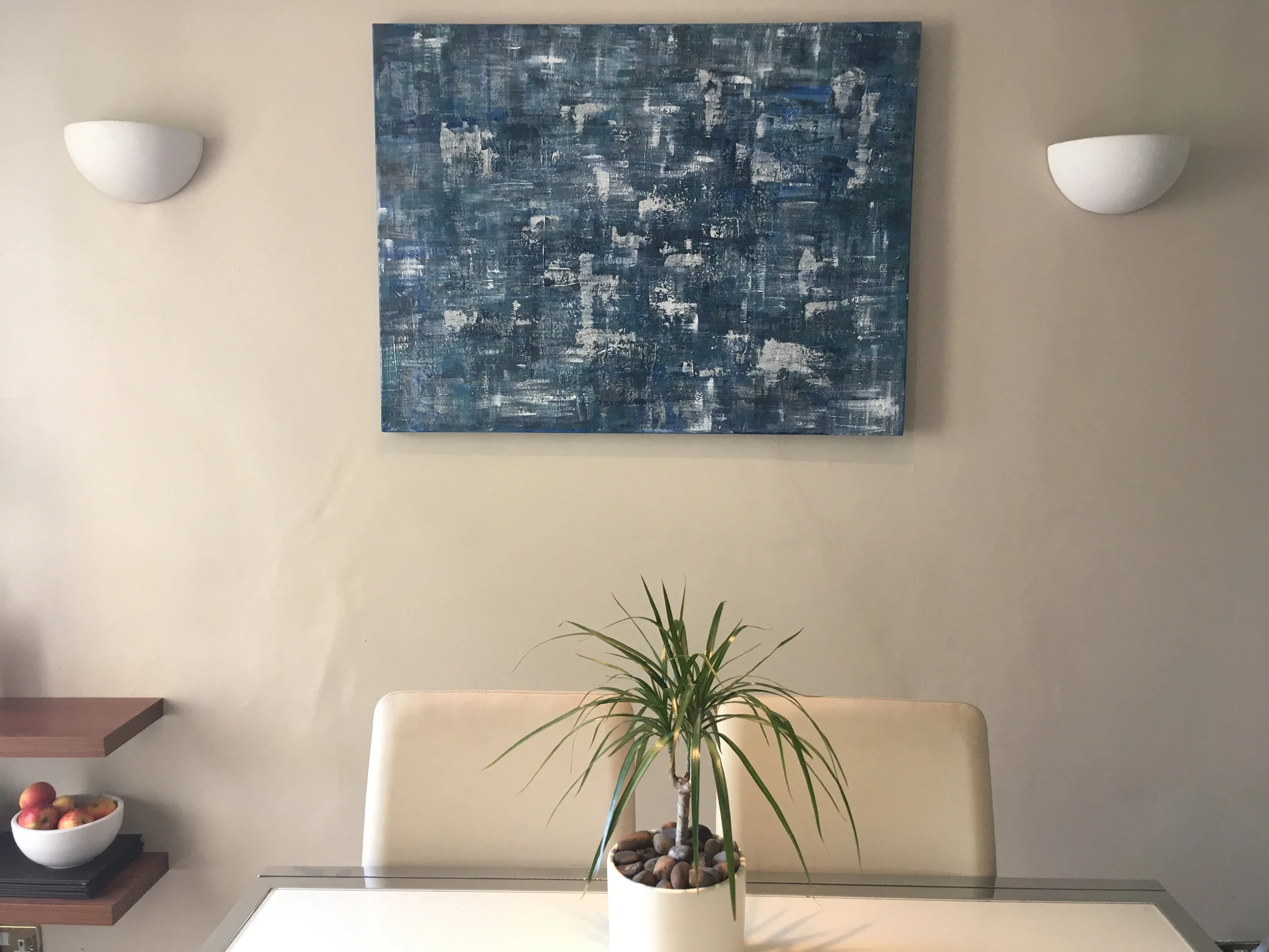 It was made for a friends new home, the colours chosen match his rug and blue and grey ombre feature wall.